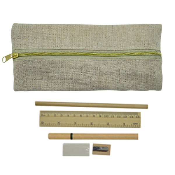 CARTUCHERA DE JUTE (INCLUYE LAPIZ, LAPICERO, REGLA, TAJADOR Y BORRADOR)