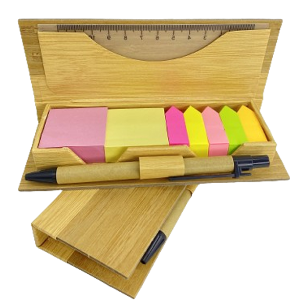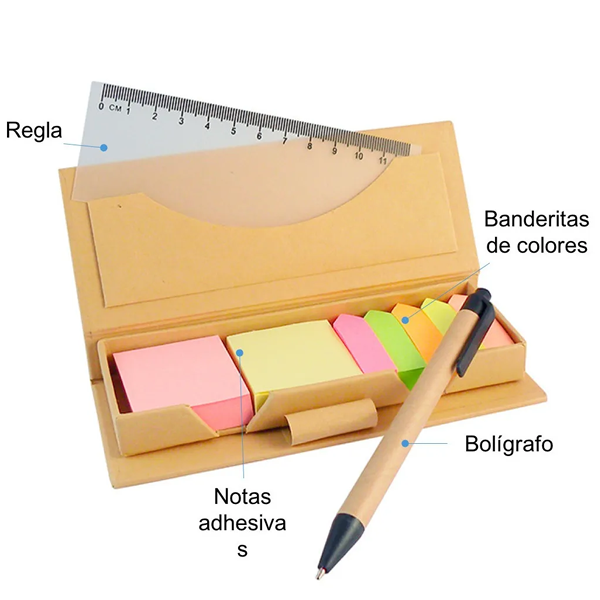 KIT Completo: Estuche ecológico + Post it Notas adhesivas + Banderitas adhesivas de colores + Regla y Bolígrafo