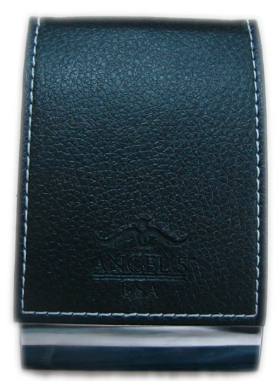 Tarjetero metálico con tapa recubierta en biocuero. Medidas: 10×6.5cm. Cajita negra.